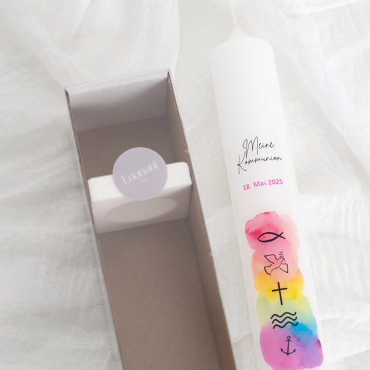 Kommunionkerze Regenbogen mit kirchlichen Symbolen rosa