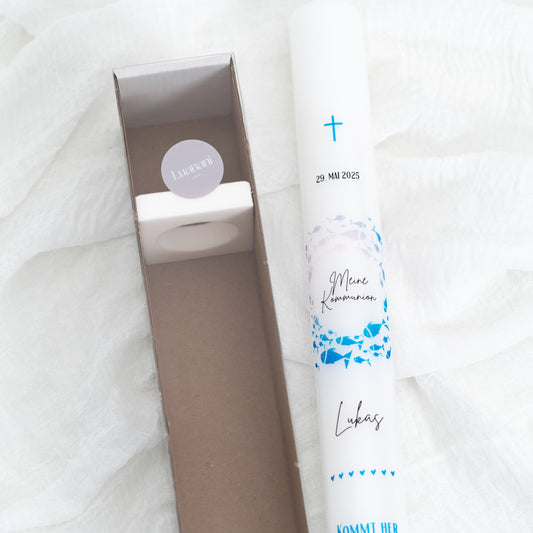 Kommunionkerze 2025 - Kommt her und esst! - Fische blau