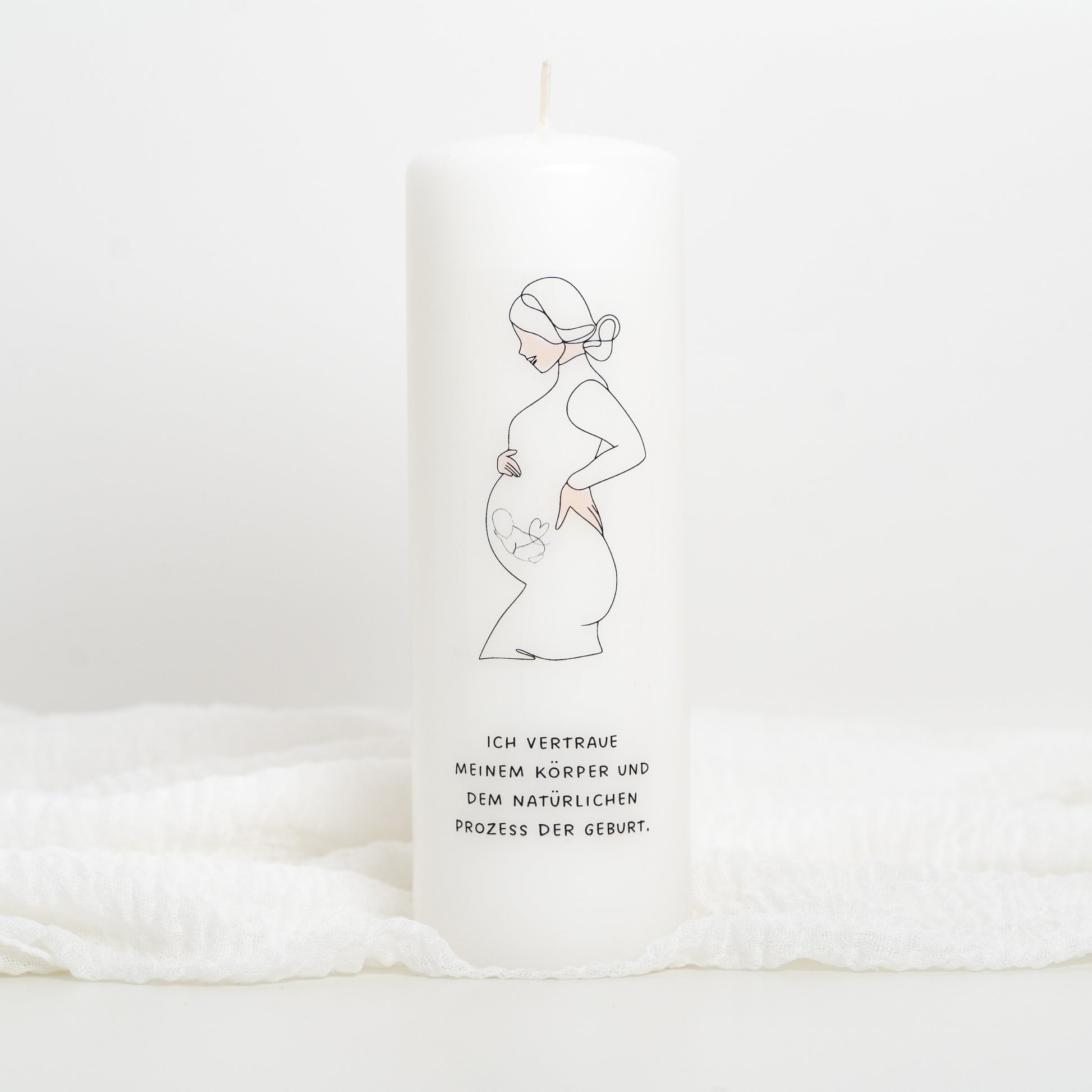 Diese weiße Freundschaftskerze mit dem Lineart-Motiv "Ich vertraue meinem Körper und dem natürlichen Prozess der Geburt" in der Größe 18x6 cm (Brenndauer: ca. 63 Std.) begleitet dich auf deinem Weg zur Geburt mit positiver Energie und ermutigenden Botschaften.